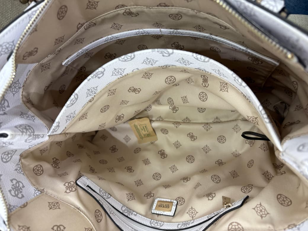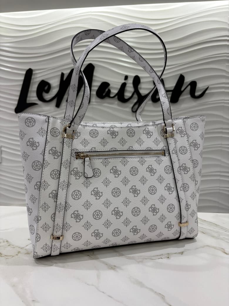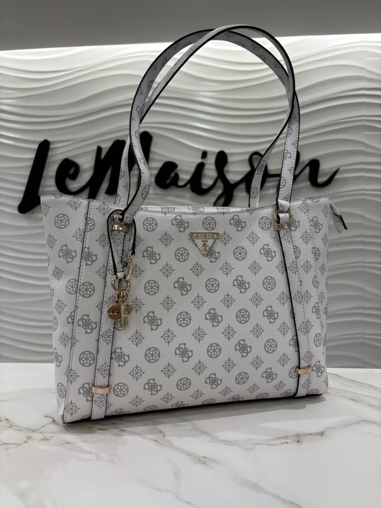 Cartera Guess grande con fondo blanco, logos grises y dijes dorados