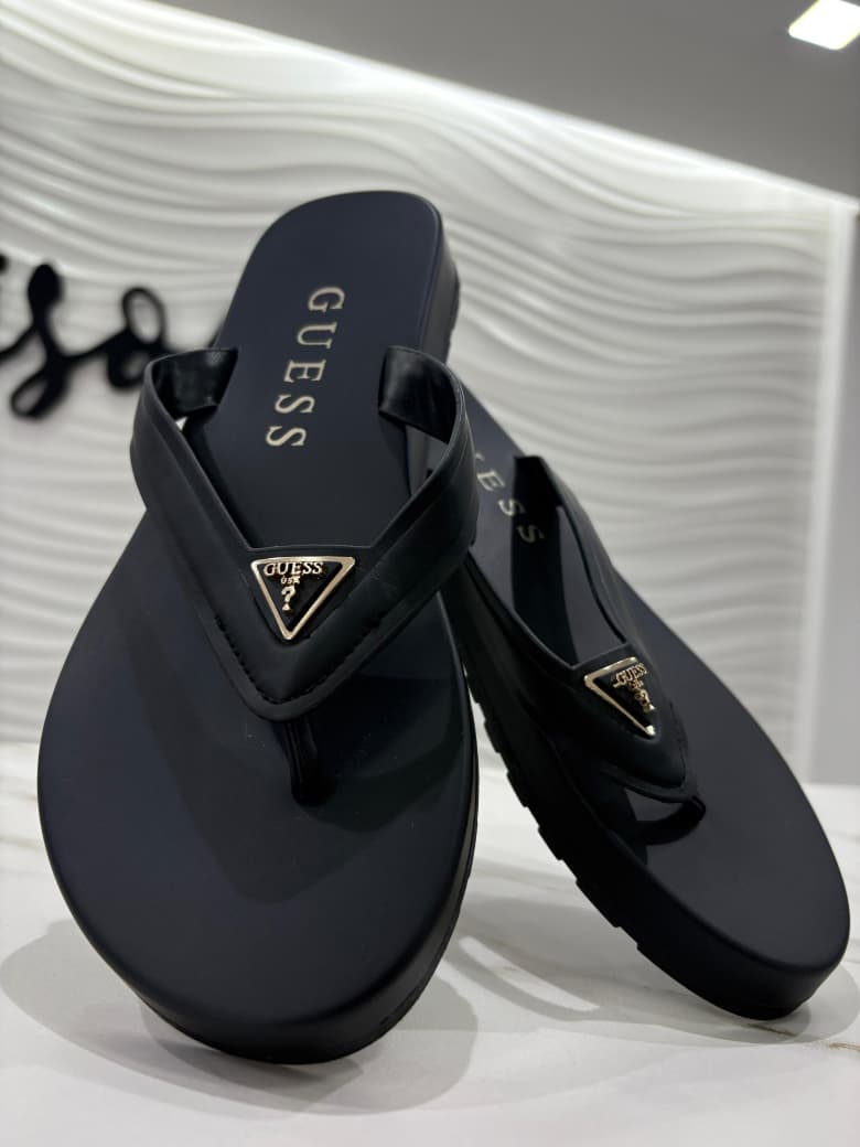 Ojotas Guess negras con logo triangulo dorado y negro